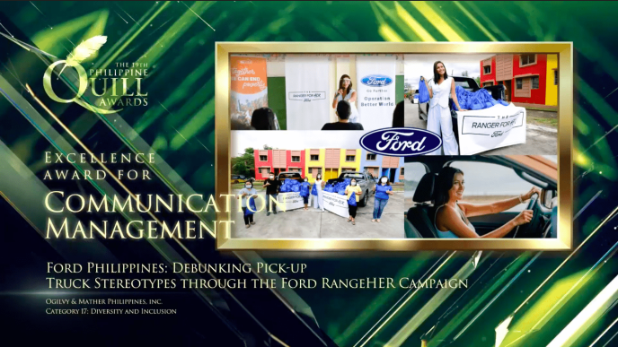 “We thank the Board of Judges of the 19th Philippine Quill Awards for recognizing our programs. Launching a campaign during the first two years of the pandemic was challenging but equally rewarding with the results and feedback we received from our stakeholders,” says EJ Francisco, Director for Communications, Ford Philippines and Asia Pacific Distributor Markets. “We are motivated even further to execute communications initiatives that resonate and are relevant to our audiences.”