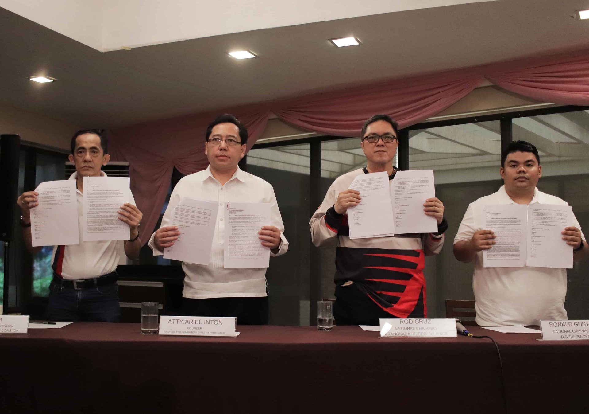 The civic groups who signed the pe33on were, Lawyers for Commuters Safety and Protec3on, Na3onal Na3onal Public Transport Coali3on, ARANGKADA Riders Alliance and Digital Pinoys.