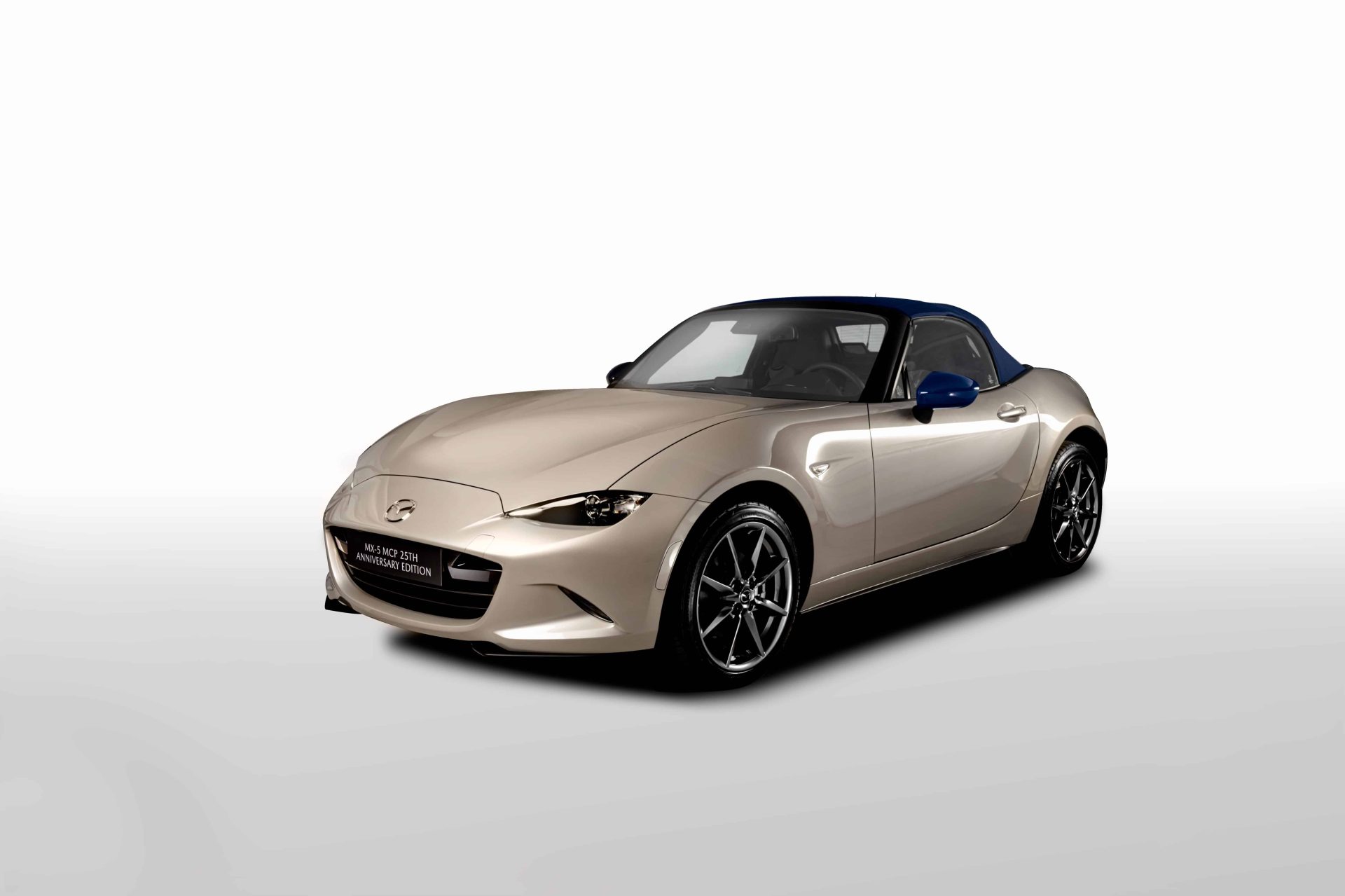 The MX-5 MCP 25th Anniversary Edition is exclusively in Platinum Quartz Metallic with a Navy Blue soft top. Navy Blue accents are also found on the side mirrors and roll hoops. Satin Silver 17-inch alloy wheels complete the exterior transformation.