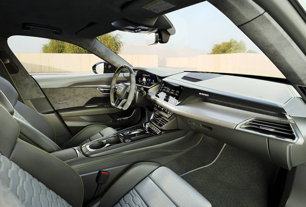 Other sustainable factors incorporated in the Audi e-tron GT are options like leather-free packages. The model’s seats are upholstered either with a combination of artificial leather and Kaskade, or with a mixture of artificial leather and Dinamica. Both Kaskade and Dinamica are made of polyester fibers sourced from plastic bottles, textiles, or residual fibers from selvages. Also available to e-tron models are carpets and mats made from Econyl, a nylon fiber weave derived from surplus fabrics and carpets, and even fishing nets.
