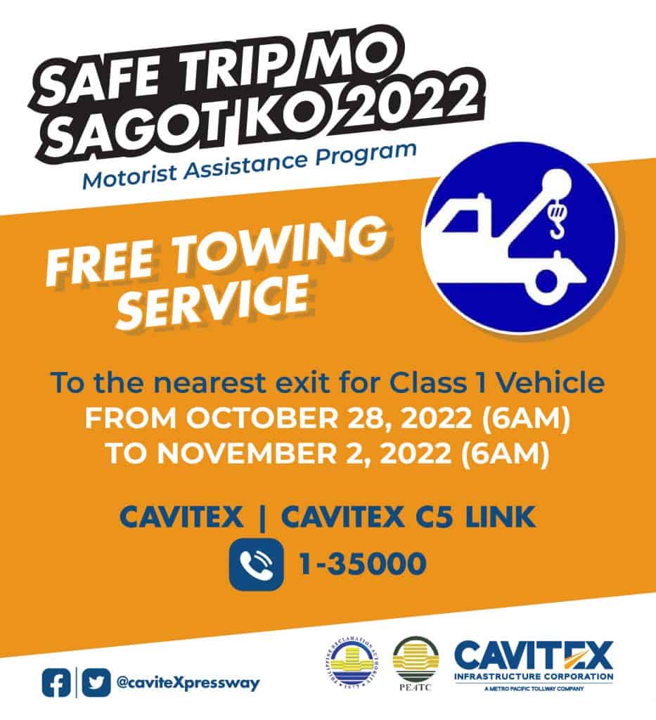 From 6 AM on October 28 up to 6 AM on November 2, 2022, MPT South toll roads will provide free towing to the nearest exit for Class 1 vehicles needing assistance. There will be intensified 24/7 motorist assistance and will augment the deployment of traffic operations personnel at toll plazas and on the ground to ensure smooth traffic. CAVITEX Customer Service Centers (Cavite and Manila bound) will be available 24/7 for RFID health check, installation, and reloading. Additional cash lanes for cash-paying motorists will be open to cater to seasonal travelers with no RFID.