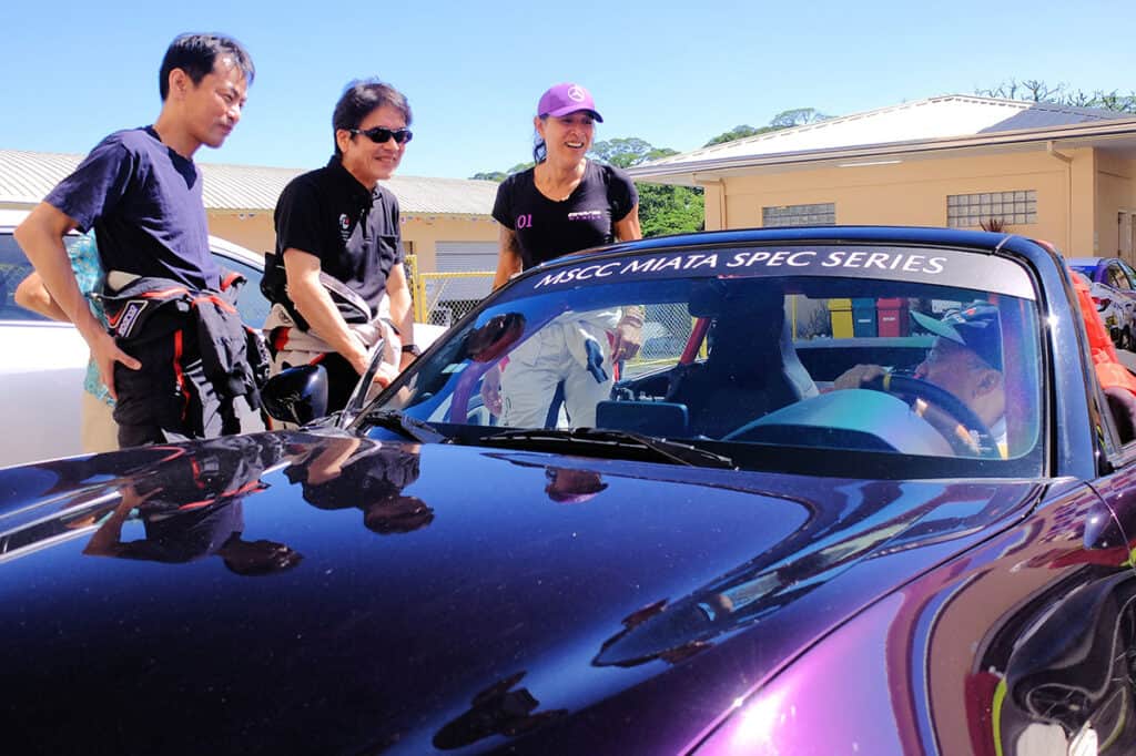 Mazda Japan’s Hironori Tanaka and Hidetoshi Kudo, together with Mazda Spec racer Angie King chat with Steven Tan (behind the wheel).