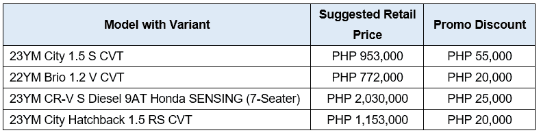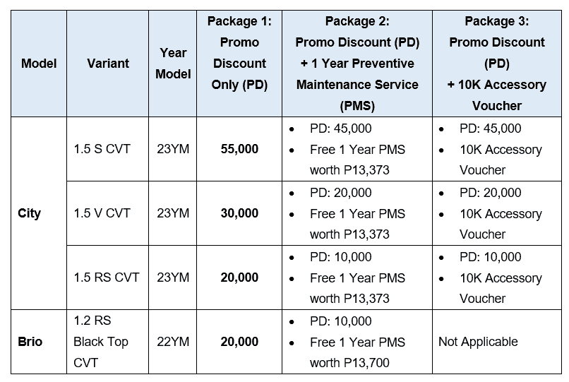 Customers who will purchase any of the variants of City sedan and Brio 1.5 V CVT have the option to choose one (1) Choose Your Own Deals promo package that best fits their needs: