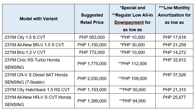 All these offers include a three (3) year LTO Registration and Chattel Mortgage, and a free one (1) year Comprehensive Insurance through select bank partners. Customers may submit their bank loan applications online at www.hondaphil.com via the auto loan link page for select bank partners, subject to the preferred bank’s approval.