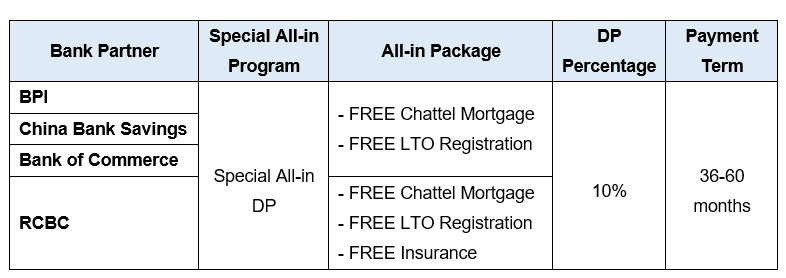 A special all-in financing program applicable for a 10% downpayment with 36-60 months payment terms is also offered for select models: