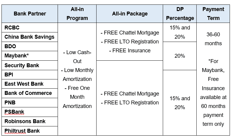 Customers are also entitled to neat financing promo offers such as low cash-out, low monthly amortization, free one (1) month amortization at 15%, and 20% all-in downpayment offers, available with the following bank partners: