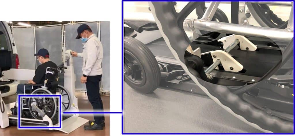 The task is also taxing on drivers, who must squat down to attach the hooks. With Toyota’s one-touch device, anyone can easily and securely fasten a wheelchair by simply pressing a button.