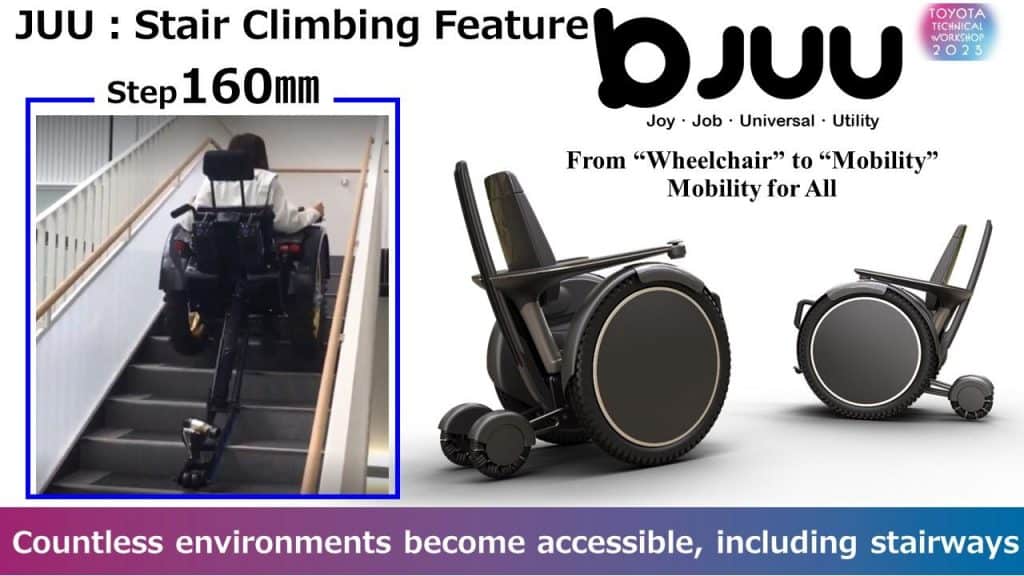 The JUU is an electric wheelchair previously showcased at the 2022 International Home Care and Rehabilitation Exhibition. Its most significant feature is the ability to negotiate steps up to 16 cm tall (30 cm deep) while seated.
