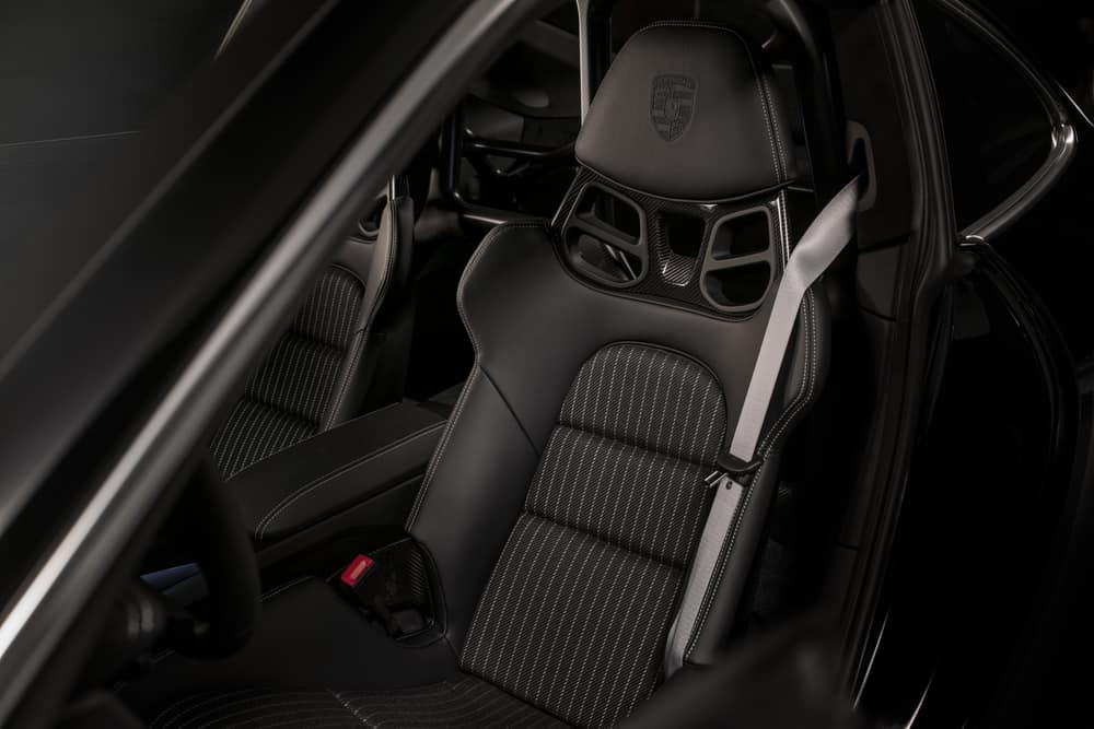 The aerodynamics of the 911 S/T are also optimised for the public road rather than the racing track. The anniversary model is equipped as standard with a Gurney flap on the extending rear spoiler. Standard equipment also includes 20-inch (front) and 21-inch (rear) lightweight centre-locking magnesium wheels. Ultra-high-performance 255/35 ZR 20 tyres, meanwhile, ensure a high level of mechanical grip at the front of the car. On the rear, the 911 S/T features 315/30 ZR 21 tyres. CFRP full bucket seats come as standard. The four-way-adjustable Sports Seat Plus is available at no extra charge. The instrument cluster and the clock of the Sport Chrono package are finished in a classic green Porsche colour scheme.