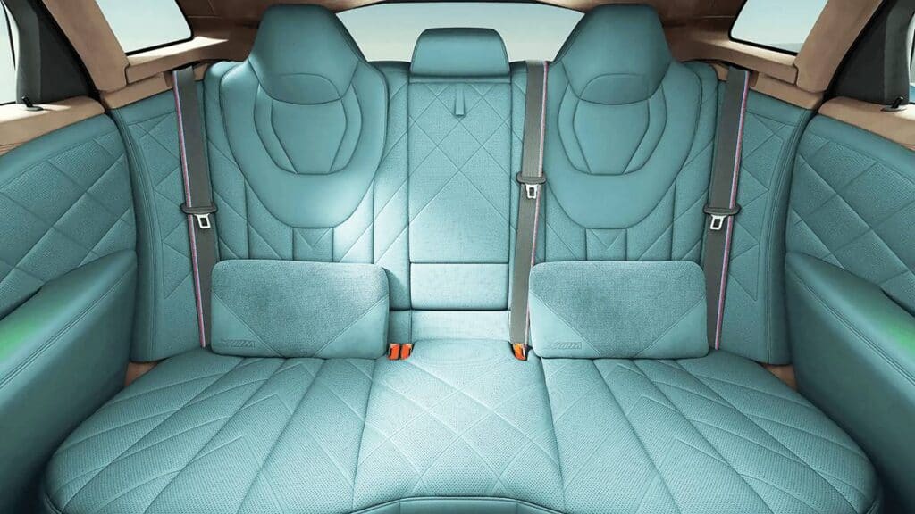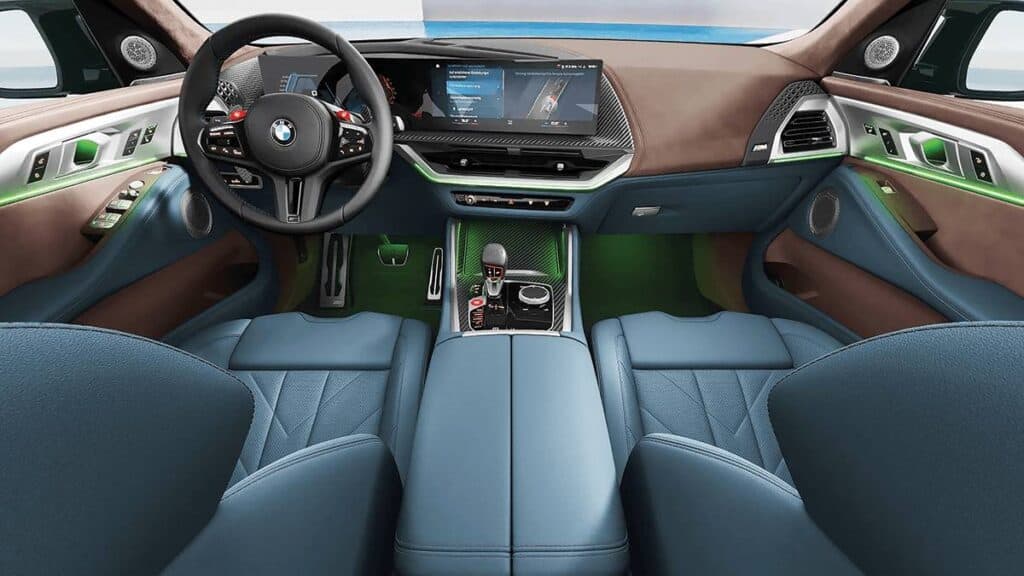 While the exterior of the XM demands attention, the interior cabin is driver-focused and all about bringing a luxurious experience to its passengers. In fact, the rear of the BMW XM is, at best, an exclusive M lounge. The interior is wrapped in BMW Leather Merino, with extended contents in Deep Lagoon upholstery, while the trimmings of upper sections of the instrument and door panels are finished in carbon fiber. There is also a sculptural headliner with a unique three-dimensional prism structure, photo mount-style border, and 100 LED units for illumination.