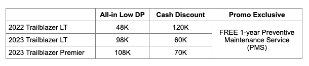 This Chevrolet compact SUV can land on your garage with FREE 1-year PMS for as low as P48K All-In Low Down Payment or as much as P120K Cash Discount. See the promo range below: