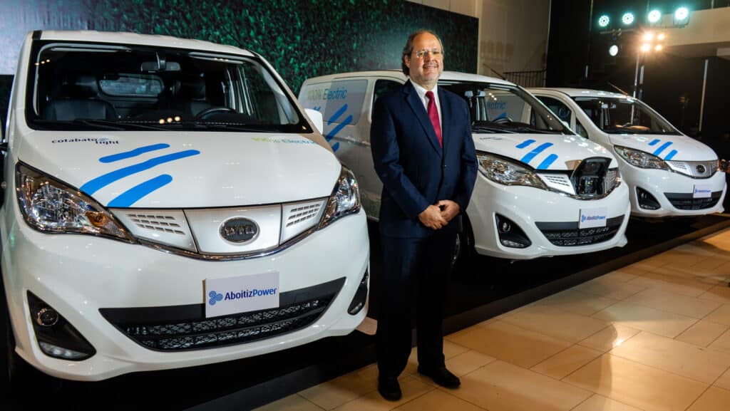 AboitizPower Distribution Utilities COO Anton Perdices poses with fully electric BYD vehicles acquired by the company.