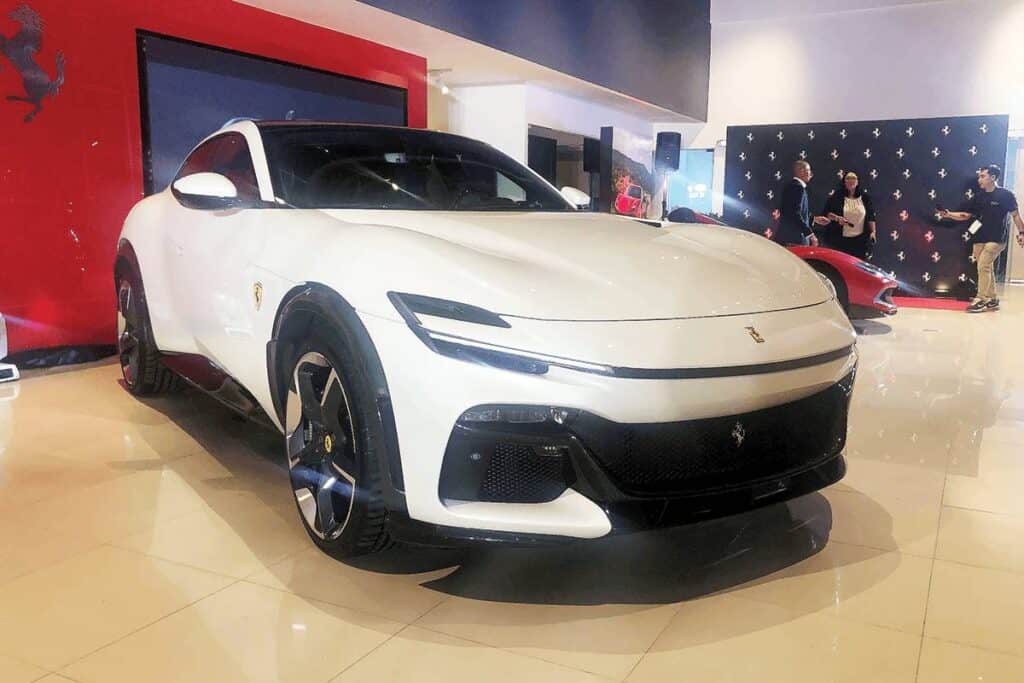 The Ferrari Purosangue (Pure Blooded) is the first-ever four-door, four-seater car in Ferrari’s 75-year history. Built on a brand-new platform, it is constructed from high-strength aluminum alloy, steel, and carbon fiber. It features the unique “welcome doors”—a hidden, motorized set of rear doors that allows easy access to the back seats.