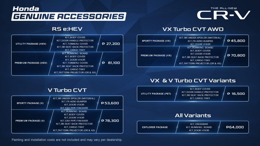 Customers can personalize their All-New Honda CR-V with a wide variety of accessories available. These accessories further highlight the All-New CR-V’s sleek and dynamic design, as well as expand the SUV’s practicality. There are also four accessory packages available for the SUV, namely the Utility Package, Sporty Package, Explorer Package, and Premium Package.