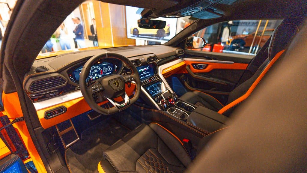 The display unit was swathed in Arancio Borealis paint, a color shared with the Huracan. The Urus embarrassment of riches continues with six drive modes, plus an Ego mode, to “deliver the most versatile, comfortable, and sporty super SUV experience in every environment.”