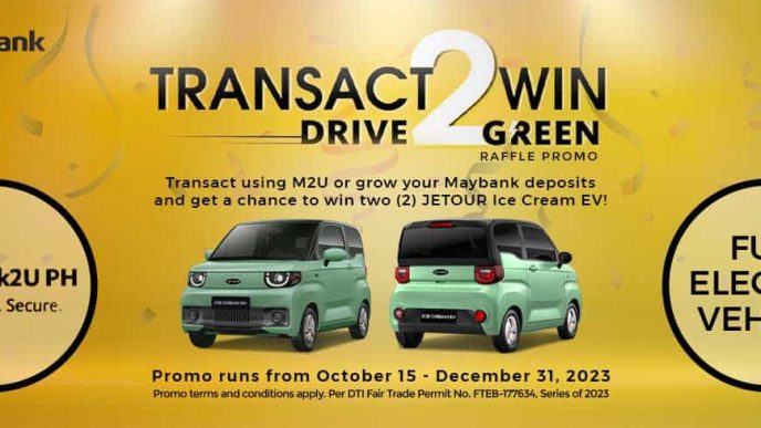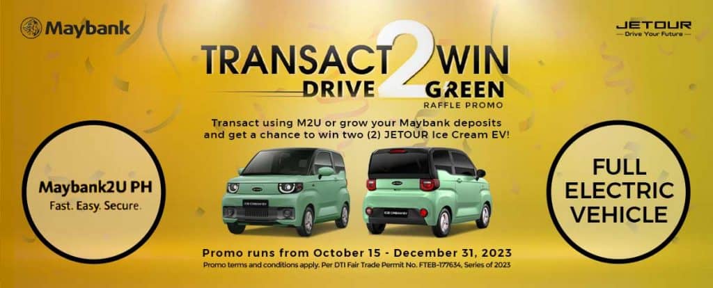 Through the Maybank Transact 2 Win, Drive 2 Green Raffle Promo, Maybank Philippines customers with qualified deposit accounts will automatically receive raffle entries to give them a chance to win a JETOUR Ice Cream as the promotion’s Grand Prize.