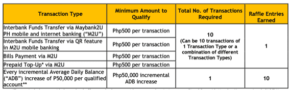 Maybank customers must perform the following transactions during the October 15 to December 31, 2023 promo period to automatically register for the promotion and earn raffle entries.