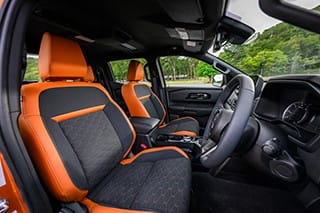 For the highest trim level, the front grille is the same color as the body, while the door mirrors, Dynamic Shield garnish, plated components including the door handles, bumper, and other parts are black, and the underside of the front, sides, and rear is dark titanium. A styling bar on the black roof rails, over fenders, and cargo bed brings a sharper look. The use of black as the base color for the metallic embellishments in the interior brings sleekness, while orange accents bring a sense of class and sharpness.
