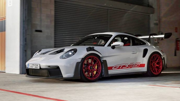 Combining a naturally aspirated engine with a lightweight structure and track-focused cooling and aerodynamic systems, the Porsche 911 GT3 RS is directly linked to the 911 GT3 R racecar. Powering it is a 4.0-liter engine outputting 525 horsepower, thanks to new camshafts with modified profiles, and motorsports-derived single-throttle intake system and rigid valve drive. Matched to the engine is a seven-speed PDK with a shorter gear ratio. These let the model accelerate from a standstill to 100 km/h in 3.2 seconds, and to reach a top speed of 296 km/h in seventh gear.