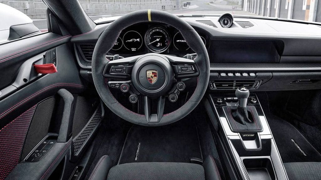 Contributing to the Porsche 911 GT3 RS’s performance are advanced aerodynamic features. Chief among these are continuously adjustable elements in the front wing and on the two-part rear wing, which generate twice the downforce compared to the previous model. The swan neck-supported rear wing is made up of a fixed main wing and another hydraulically adjustable one. A front splitter divides the air flowing over and underneath the car while side blades direct air outward.