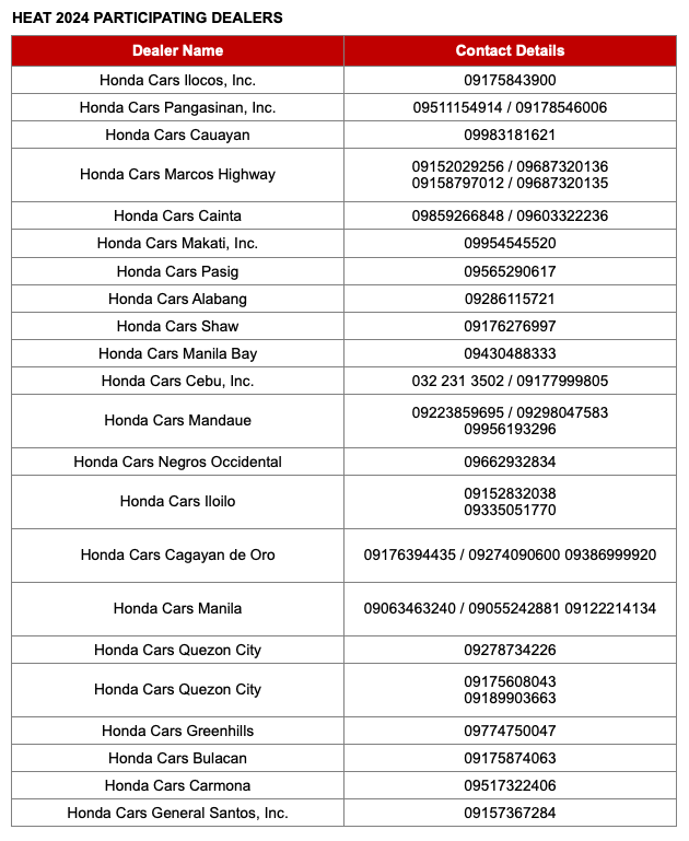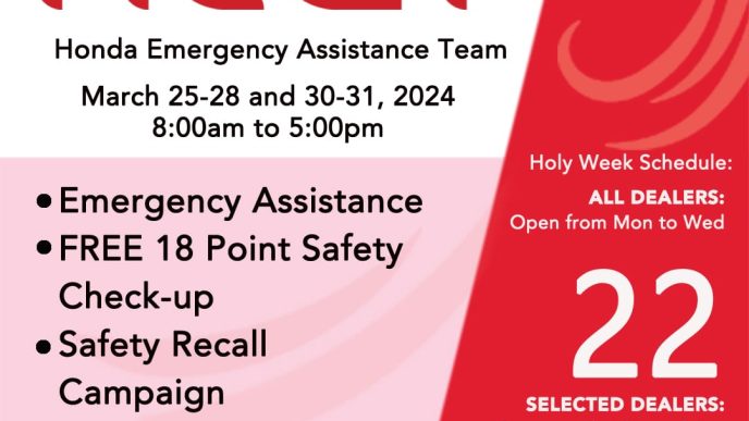With the Holy Week holidays upon us, Honda Cars Philippines, Inc. (HCPI) would also like to announce its Honda Emergency Assistance Team (HEAT) program, aligned with Honda’s global safety slogan, ‘Safety for Everyone’. While all Honda Dealers will be open from Holy Monday to Holy Wednesday, the dealers that are offering HEAT this year are ready to serve you from Maundy Thursday, March 28, to Easter Sunday, March 31.* Should Honda owners need any further assistance, they may visit any of the 22 Honda Dealers listed below to avail of the following services through HEAT: