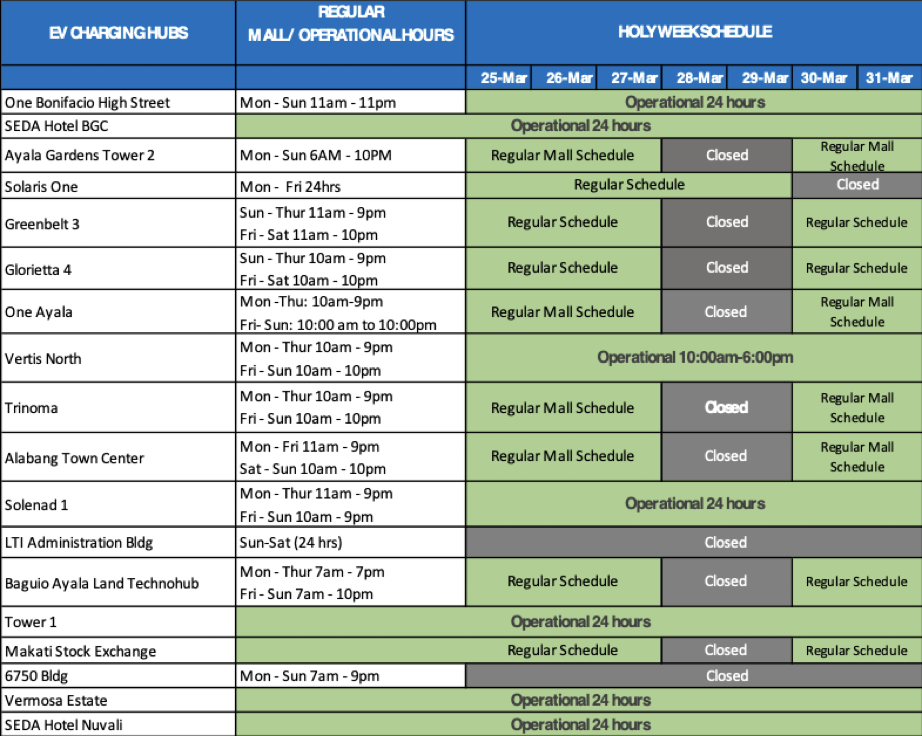 For electric vehicle owners who will be on the road this Holy Week and for those planning future EV travels, ACMobility Charging Hubs are accessible on the following schedules: