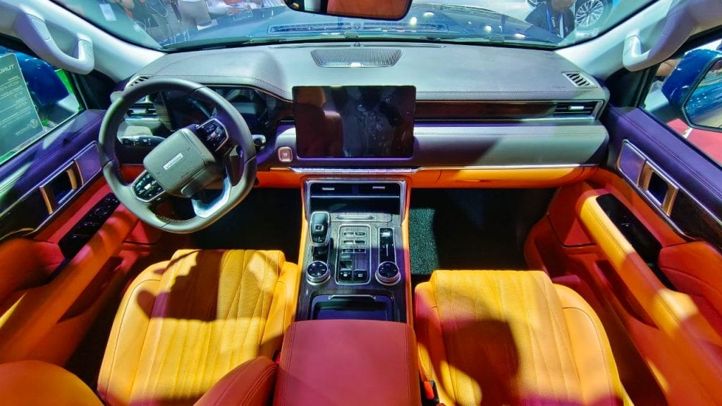 Inside their highly spacious cabins, the Tunland V7 and V9 feature luxurious orange or black-and-brown leather interiors, power-adjustable seats, a leather-wrapped multi-functional steering wheel, full LCD instrumentation, and a gigantic 14.6-inch multimedia touchscreen infotainment system with Carbit and Bluetooth wireless and USB connectivity, among many more luxury, comfort, and convenience features.
