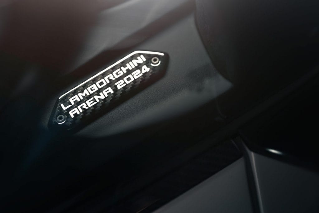 The interior trim echoes the exterior colors, with Nero Ade (black) sport seats featuring stitching and piping in the Verde Scandal hue, the same color used for the Lamborghini logos embroidered on the headrests. The bulkhead panel lining is embellished with exclusive embroidery depicting the map of the Imola Circuit, the lettering “Lamborghini Arena 2024” in Bianco Leda (white), and escape route maps in Verde Scandal (green). Also exclusive are the carbon fiber plates with “Lamborghini Arena 2024” and “Ad Personam” logos located on the ends of the dashboard.