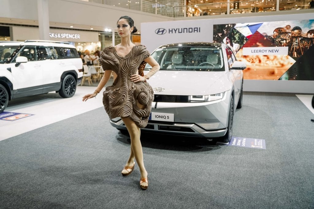 Lastly, the “Bioniq 1.0” is an eye-catching ceiling installation of an upside-down vehicle, showcasing a reimagined IONIQ 5. The life-size applied sculpture was created by Leeroy New, a Filipino sculptor, street artist, jewelry maker and fashion designer. The multi award-winning designer’s works combine sustainability with fashion and innovation. It is made entirely of biodegradable and renewable materials and other agricultural surplus like sawdust, bamboo, rattan, and copper grounds. He also has a display of wearable art called the “Carapace BioSuit”, which is made of reconstituted sawdust.