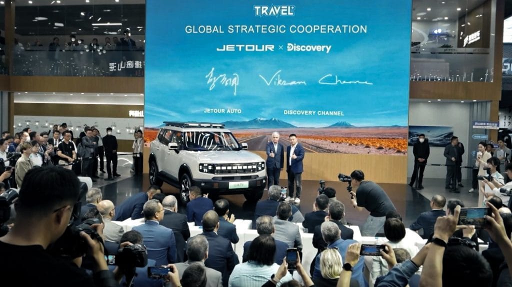 A highlight of Auto China 2024 was the collaboration between JETOUR Auto and the Discovery Channel, Warner Bros’ flagship channel, for JETOUR’s “Travel+” concept highlighting the journeys and explorations to the unknown, and breaking boundaries—which aligns with JETOUR’s brand spirit and development and upholding the concept of “Travel+,” instilling in its user the fearless attitude toward the rugged road ahead, just like its SUVs. At the signing of the strategic collaboration were Vikram Channa, Warner Bros. Discovery Vice President (left), and Li Xueyong, President of JETOUR Auto International (right).