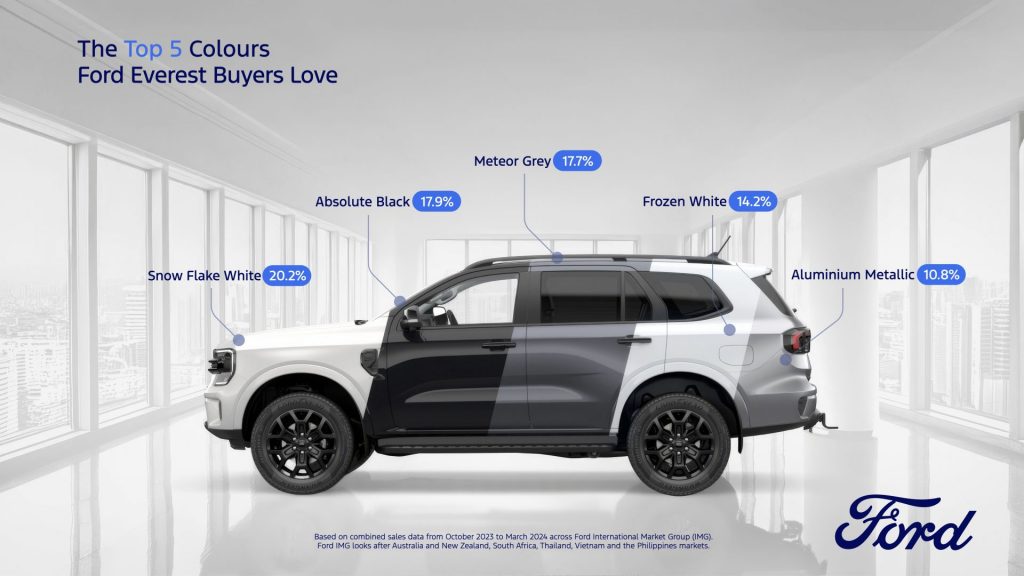 White is also the most popular color for Everest with Snow Flake White (20.2%) and Arctic White (14.2%) making up 34% of the sales mix across Ford IMG. Absolute Black is the second most favorite color (17.9%) closely followed by Meteor Grey (17.7%). In fifth place is Aluminium Metallic (10.8%).