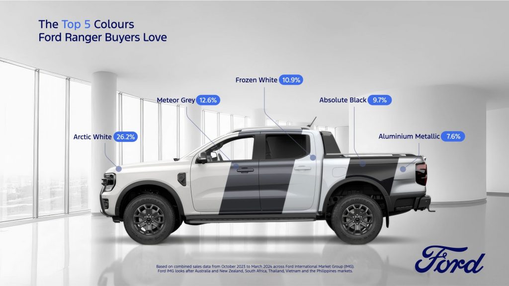According to sales data1 from across Ford IMG, more than 35% of all the Rangers sold in the last six months were in shades of white (Arctic White at 26.2% and Frozen White at 10.9%). In a distant second is Meteor Grey (12.6%) and coming in at 4th and 5th place are Absolute Black (9.7%) and Aluminium Metallic (7.6%), respectively.
