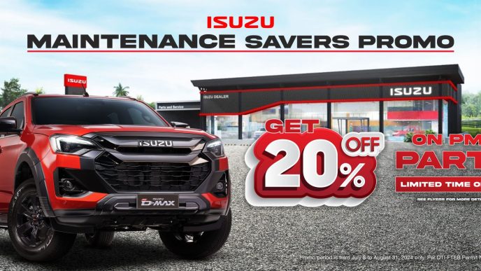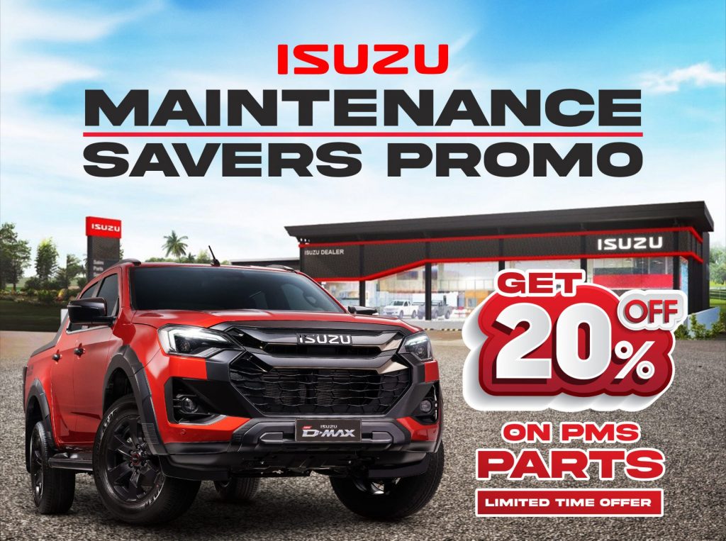 Available at all authorized Isuzu dealerships nationwide, the Isuzu Maintenance Savers Promo cannot be availed in conjunction with other Isuzu promo or discounts, and a can only be availed at participating authorized dealerships, including caravans and on-site servicing within the promo period.