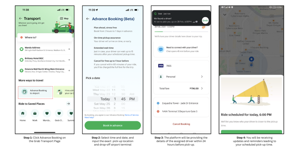 Accessing Grab Advance Booking is a walk in the park. Passengers can select “Advance Booking” under the Grab transport page. They can then enter the date and time of their ride, along with their pick-up location and the specific airport terminal for drop-off.