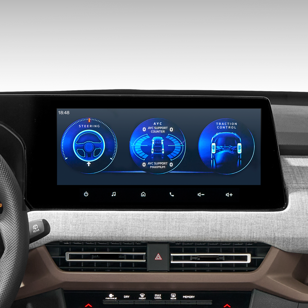Avionics shows a plethora of vehicle information such as the current drive mode, steering input, individual tire pressure (for GT variant), brake pressure, and coolant temperature, as well as ambient temperature and barometer. In terms of the three drive modes, the RELIABLE view shows the Steering Angle, Active Yaw Control (AYC) Monitor and Traction Control, while the ADVENTUROUS view displays the Altitude, Tilt Angle and Compass. Meanwhile, RESPONSIVE displays the Torque, Acceleration and Fuel Economy (both Instant and Average).