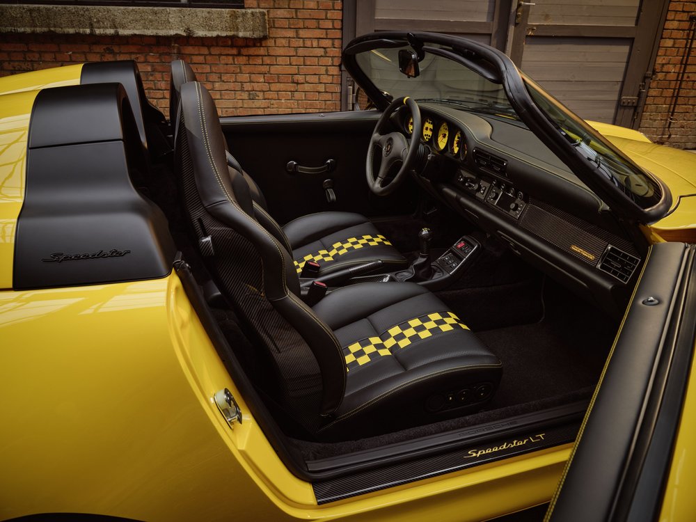 The interior is dominated by black leather with decorative stitching in yellow. The headrests feature an embroidered Speedster logo. The visual highlight of the interior is provided by the seat centres, which bear a check design in yellow and black. A masterpiece of craftsmanship, with every check being tailored and sewn by hand. The same pattern adorns the front luggage compartment upholstered in leather, the car cover, and a matching touring bag. Carbon elements on the dashboard, centre console and handbrake and gear levers further individualise the interior. The backs of the seats are also in carbon. For the first time in a Porsche 911 of Type 993, the carbon door sill trims are illuminated – in ‘Otto Yellow’, of course – and carry an individual logo.