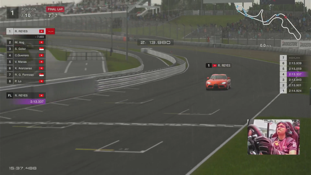 Following the Quarterfinals was the Semifinals, which pitted the Top 20 against each other on the Suzuka Circuit in the Toyota GR Supra RZ ’20. Similar to the Quarterfinals, the Semifinals held three race heats for two batches of 10 players each. Qualifying time trials were done for the first and third races, while the second race reversed the grid, putting the top placers of race one at the back. Weather conditions, which were chosen at random, were thrown into the races to further test the skill of the drivers. The first race was met with drizzle, the second race with dry weather, and the third race with full-on rain.