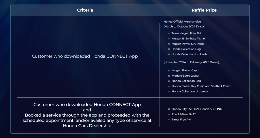 To make Honda CONNECT even better, the Download and Win raffle gives all Honda CONNECT users the chance to win various prizes. Installing the app on its own already merits an entry to win Honda Official Merchandise. Additional prizes await those who will make the most out of Honda CONNECT and book a service through the app. These users will be granted an entry to the grand draw, in which the prizes are 1) 1-Year Periodic Maintenance, 2) All-New BeAT, or 3) a brand-new Honda City 1.5 CVT Honda SENSING.