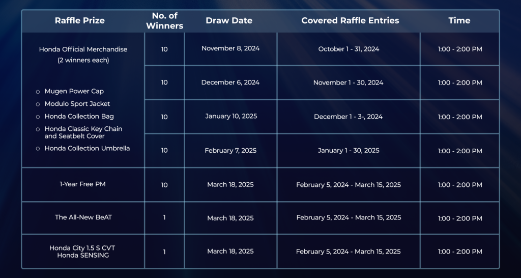 Honda CONNECT users must register their raffle entries by proceeding to the Honda CONNECT Raffle Entry page at https://www.hondaphil.com/app-raffle and providing their app’s registered mobile number and email. Winners will be notified through the one-to-one message feature in the Honda CONNECT Mobile Application as well as via letter notification sent to their registered mailing address and email. Additionally, winners will also be announced on the official raffle promo website and social media accounts of HCPI.
