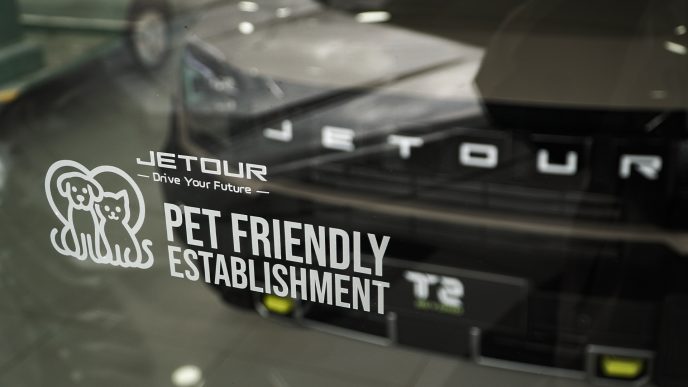Starting this October, pet-friendly stickers will be displayed prominently on the entrance doors of JETOUR dealer sales showrooms. These stickers, featuring a simple dog and cat paw print design along with the text “Pet Friendly Establishment,” signify that all pets are welcome in the showrooms.