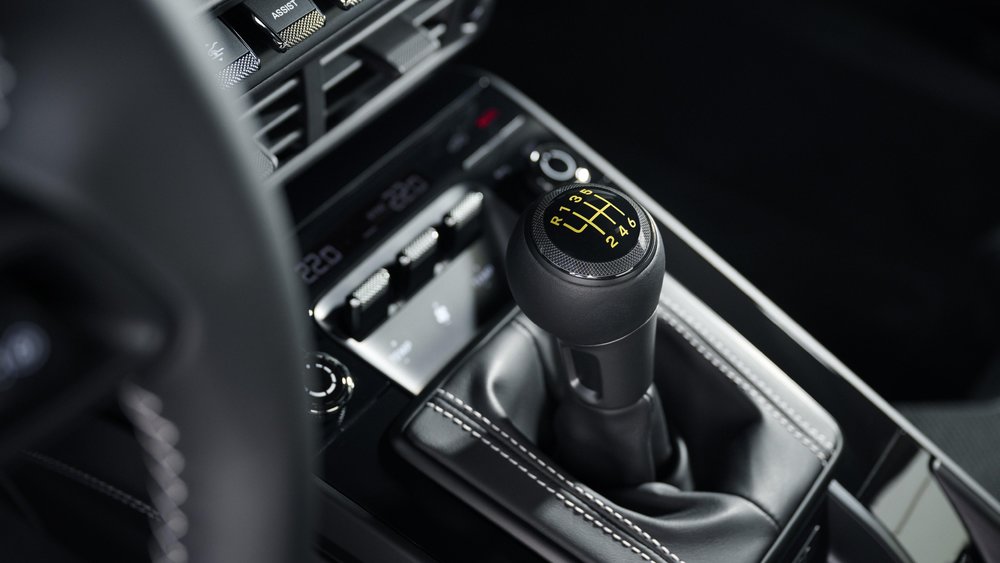 For the 911 GT3 with Touring package, Porsche offers the Leichtbau package. Here, the roof painted in the exterior colour as well as the stabiliser, coupling rods and shear panel on the rear axle are made of CFRP. The lightweight magnesium forged wheels and the lightweight door panels are also part of the package. In conjunction with the standard 6-speed GT sports gearbox, the shortened gear lever from the 911 S/T is used. In front of the gear lever, a plaque with the inscription “Leichtbau” indicates the package.