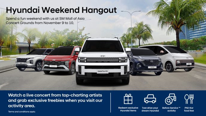 The activity area will feature a display of the brand’s latest line-up, the SANTA FE Hybrid, TUCSON Hybrid, as well as the STARIA, STARGAZER, CUSTIN, and CRETA. Customers can enjoy getting behind the wheel of select Hyundai vehicles when they register for a test drive at the activity area. Hyundai aftersales also makes itself available even beyond dealerships by offering a free 23-point check-up available for all Weekend Hangout visitors – regardless of brand – for a comprehensive assessment of their vehicles.