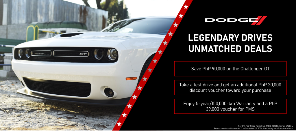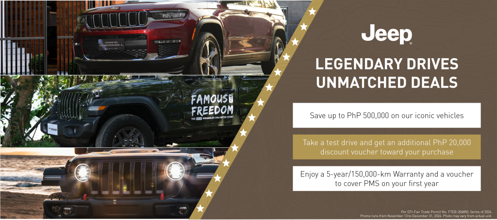 Kick-start the feast! Chrysler, Dodge, Jeep, and RAM Trucks (CDJR) is here to deliver four (4) gifts from November 15 to December 31, 2024. Celebrate the holidays by driving home your own iconic Dodge and Jeep vehicle! Visit any of the five (5) CDJR dealerships nationwide and avail of huge cash savings of up to PhP 500,000, additional e-voucher discounts, and exclusive after sales special deals.