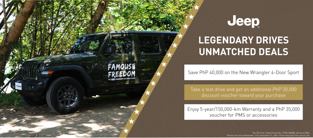 - MY2024 Wrangler 2.0L 4-Door Sport – PhP 40,000 off
