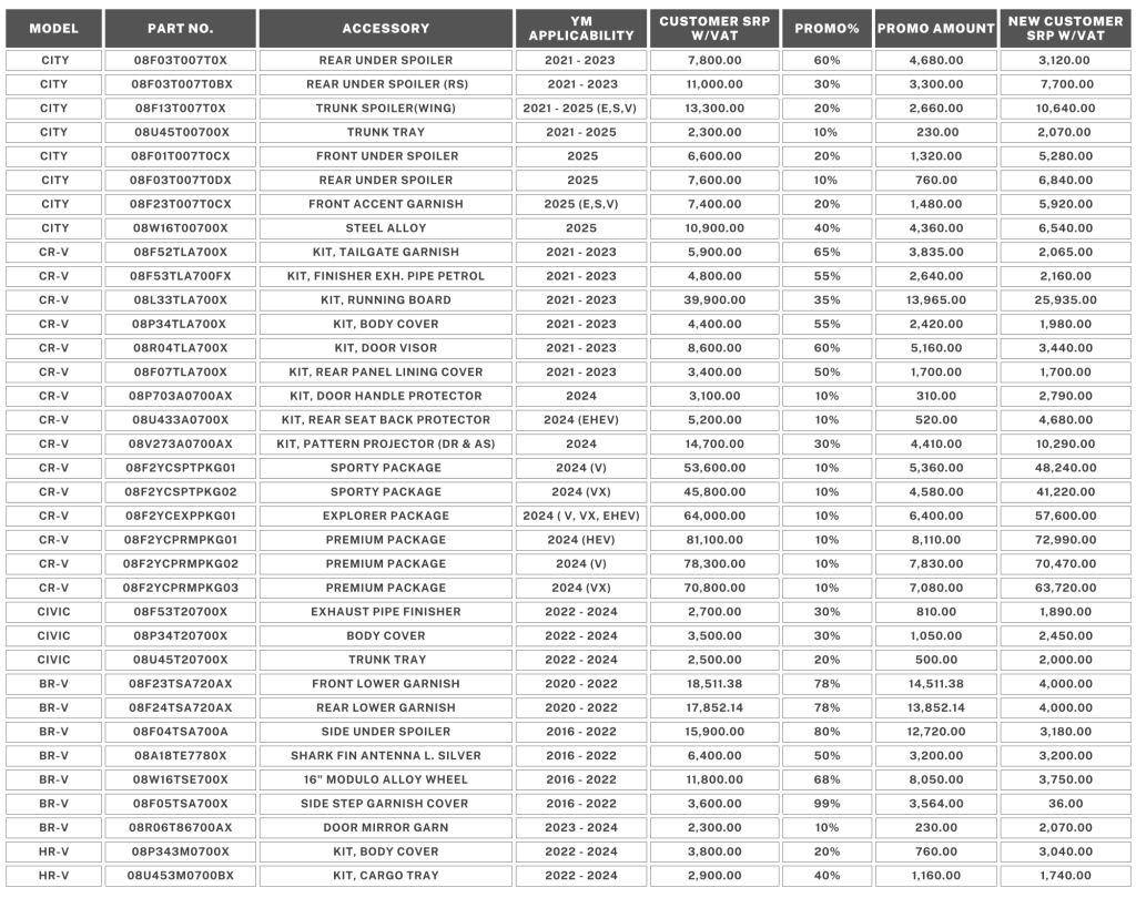 - All customers may avail up to PHP14,000 savings on select accessories until the end of the promo period. Please see discounted accessory parts below: