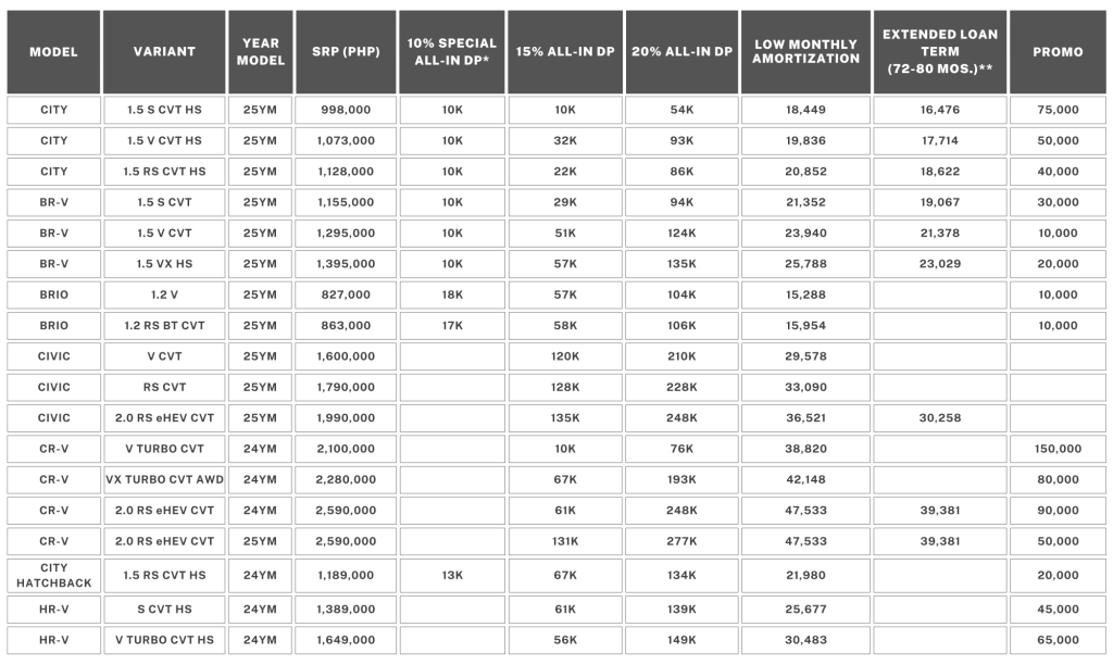 - Low Cash-out and Low Monthly Amortization All-In Bundle applicable for current e:HEV models: Customers are entitled to 15% or 20% downpayment for 36 to 60 months. Moreover, discounts can be applied to lower the downpayment. Fifteen Percent (15%) downpayment is not applicable to PSBank. This is subject to bank approval.