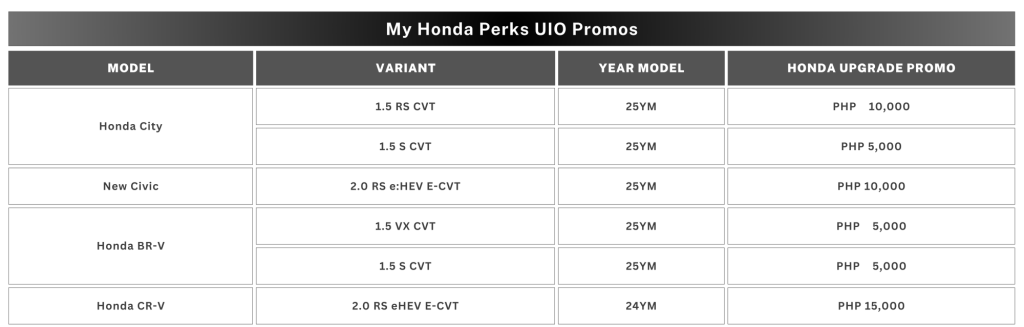 - All existing Honda car owners who will repurchase any variant included in “My Honda Perks” model coverage is entitled to a promo discount on top of other promotions offered for the month.