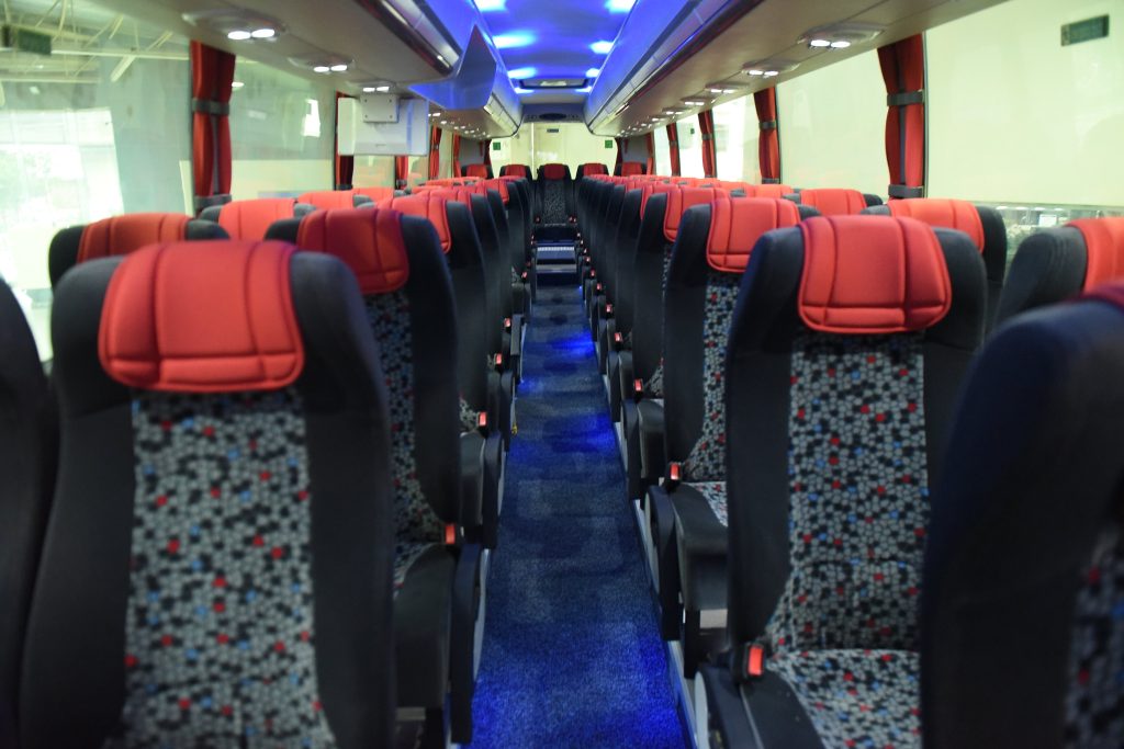 The 360 horsepower Scania K360 has a bus body built by esteemed local manufacturer Del Monte Motor Works, Inc. This 49-seater bus with 2×2 configuration boasts plush leatherette seats with a cushioned headrest and are reclinable. The bus is also equipped with a well-appointed toilet for maximum convenience. The 400 horsepower Scania K400 Touring, on the other hand, is fully imported with the bus body manufactured in China through a partnership between Scania and Higer. It also has 51 seats with 2×2 configuration but this time using imported fabric that breathe and offer excellent comfort. Just like in commercial airplanes, you can stow your hand carry items in the enclosed overhead luggage compartment. Both models have audio-video onboard so you can watch movies to while away the time and all the seats have its own dedicated USB charging port, so your phone won’t run out of juice during the long trip. Passenger can also expect a smooth ride as they will hardly feel the bumps on the road thanks to an Electronically Controlled Air Suspension system.