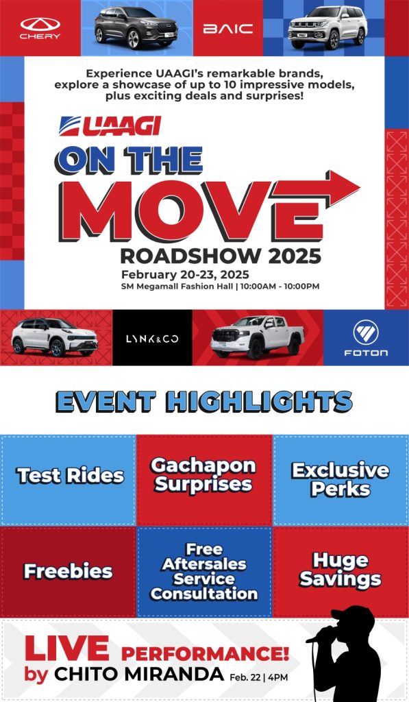 “On The Move” signifies UAAGI’s commitment to reaching a wider audience and providing Filipinos with the perfect automotive and mobility solutions for every type of driver. As one of the leading automotive distributors in the Philippines, UAAGI proudly represents BAIC, Chery, Foton, and Lynk & Co—each brand catering to the diverse needs and preferences of the discerning Filipino market. The UAAGI On The Move Roadshow Tour serves as a one-stop shop for the best deals, offering exclusive promotions and special offers throughout the event. Adding to the excitement, renowned Filipino musician Chito Miranda, of Parokya ni Edgar fame, will be performing an exclusive set for UAAGI On The Move on the afternoon of Saturday, February 22nd.
