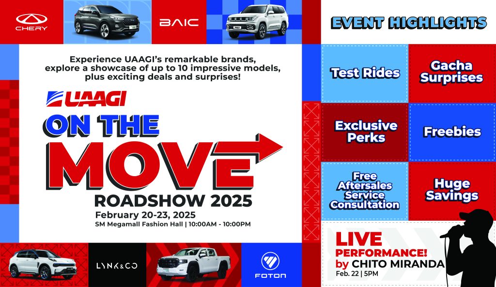 The UAAGI On The Move Roadshow Tour, a multi-brand automotive extravaganza, is set to take place at the Fashion Hall of SM Megamall from February 20-23, 2025. This exciting event marks the first leg of a four-part series happening throughout the year, bringing UAAGI’s top-notch automotive brands directly to Filipino consumers in popular destinations nationwide.